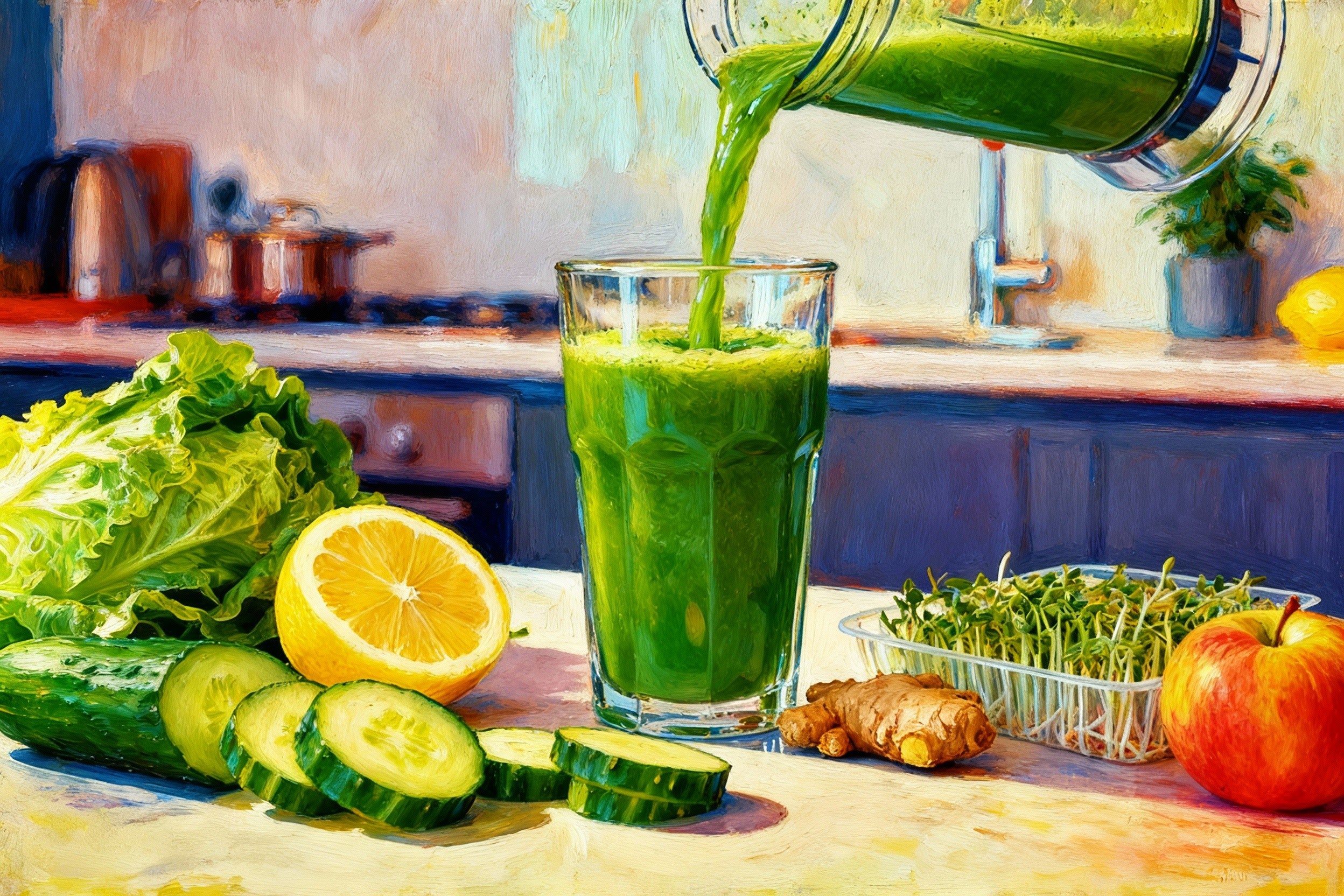 Stick to mostly greens—sprouts, celery, cucumber, dandelion tops, cilantro—for chlorophyll that builds blood and detoxes. Add a bit of fruit like lemon, grapefruit, lime of apple for vitamins and taste, but keep it under 20% or you'll ride the sugar rollercoaster.
